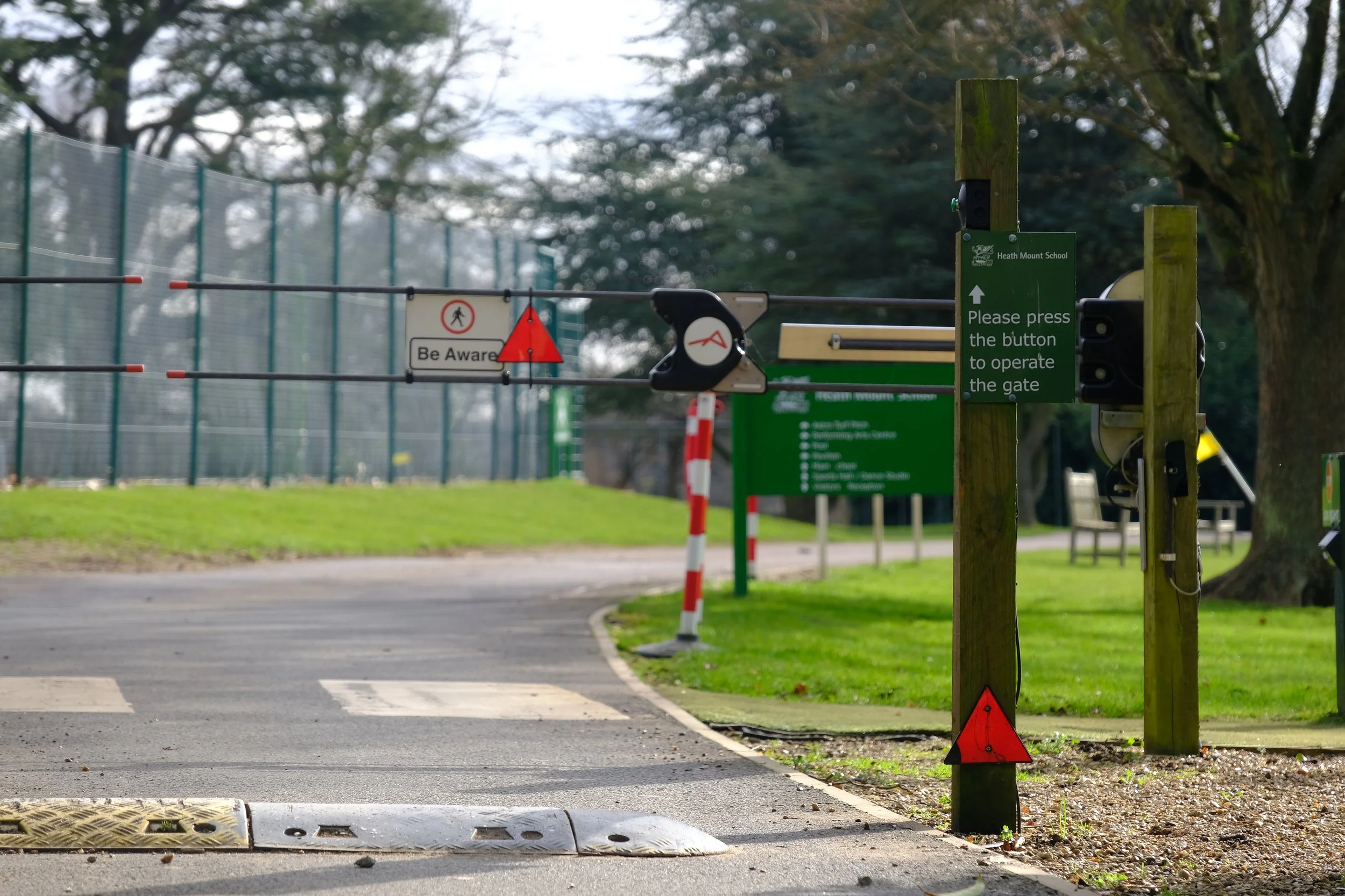 You will arrive at a second set of gates. Please press the button to operate the gate to enter the pool car park.